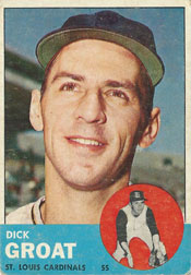 On Sept. 28, 1963, Groat entered the next-to-last game of the season with 199 hits. He tripled against the Reds’ Joe Nuxhall in the first inning for hit No. 200 and got his final hit of the season, a double off Nuxhall, in the sixth. Groat became the first Cardinals player to achieve 200 hits in a season since Stan Musial (with 200) in 1953. Boxscore