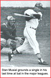 Manager Johnny Keane lifted Musial for a pinch-runner, Kolb. It was the ninth time Kolb had been used as a pinch-runner for Musial, 42, in 1963. Kolb scored in the inning on a sacrifice fly by Charlie James, giving St. Louis a 2-0 lead. In the clubhouse, Musial told reporters, “I feel pretty good. Everyone was pulling for a home run, but I’m a singles hitter, so it seemed appropriate that I should go out with a pair of ’em.”