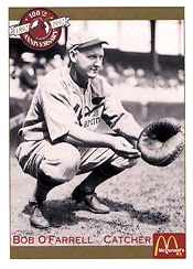 The year before, the 1926 Cardinals, with Rogers Hornsby as player-manager, finished in first place with 89 wins and defeated the Yankees in a seven-game World Series. O’Farrell’s play was significant in the success of the 1926 Cardinals. Solid on defense, he worked well with the pitching staff and batted .293 with 30 doubles and 68 RBI. O’Farrell was named winner of the 1926 NL Most Valuable Player Award.