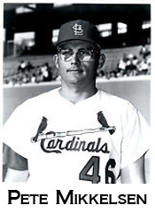 Mikkelsen’s most impressive outing for the Cardinals came on June 23, 1968, in the first game of a doubleheader against the Braves at St. Louis. Briles started, faced five batters and was lifted without recording an out. Mikkelsen relieved and pitched eight innings, allowing one unearned run and three hits. He also committed two errors. “The fans cheered derisively for Mikkelsen when he fielded a ball cleanly,” the Post-Dispatch reported. Said Mikkelsen: “I never had been cheered by so many people just for making a catch.” Boxscore