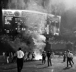 The stunt called for disco record albums to be blown up between games, but the situation got out of control when thousands of people poured out of the stands and damaged the field.