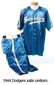 Rickey planned for the 1944 Dodgers to wear white satin uniforms with blue piping for night home games, and blue satin uniforms with white piping for night road games.